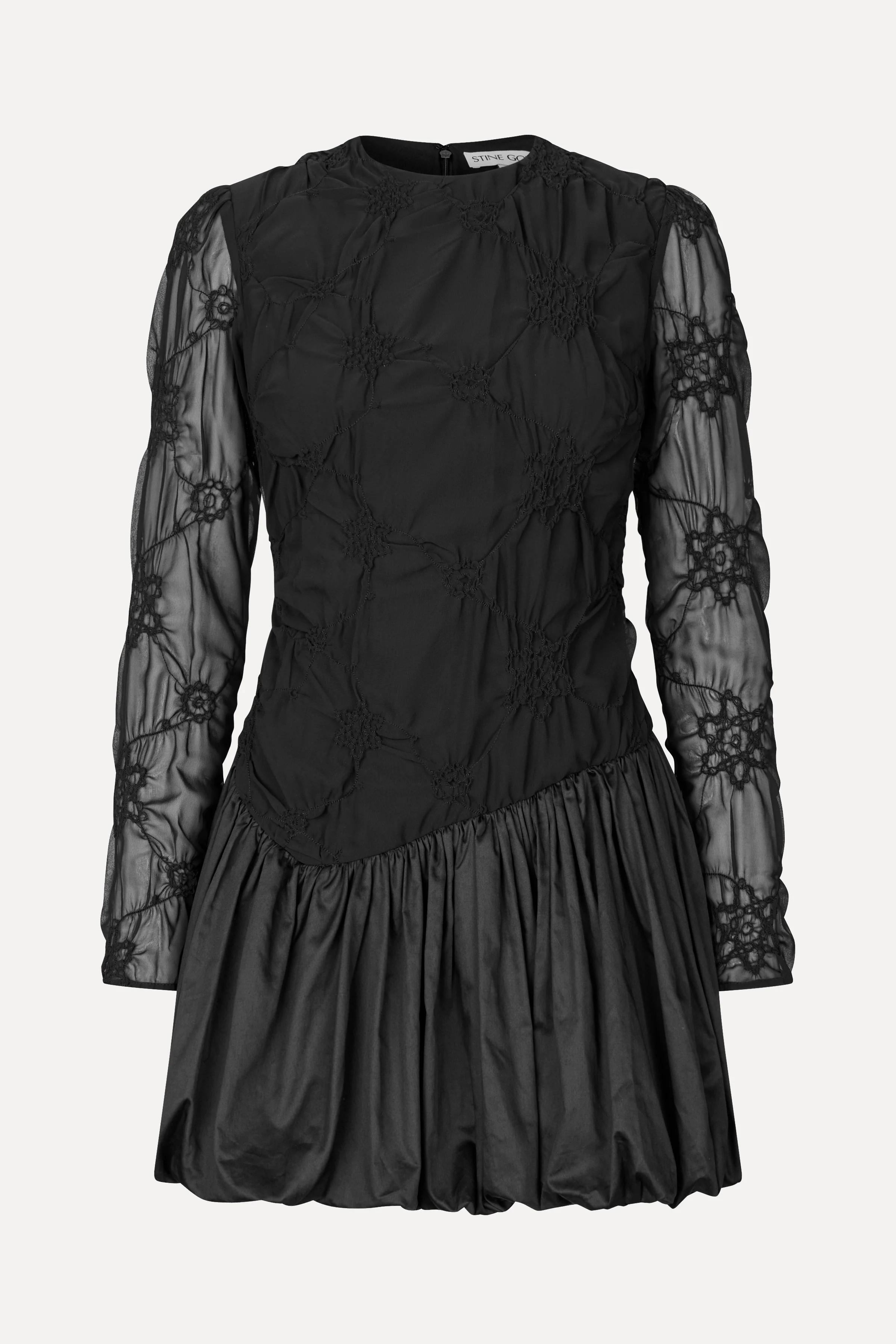 Black mini dress with smocked floral artwork on the bodice. Designed with a lined body, semi-transparent long sleeves, and a voluminous balloon skirt in crisp cotton. Finished with a hidden zipper at the back.
