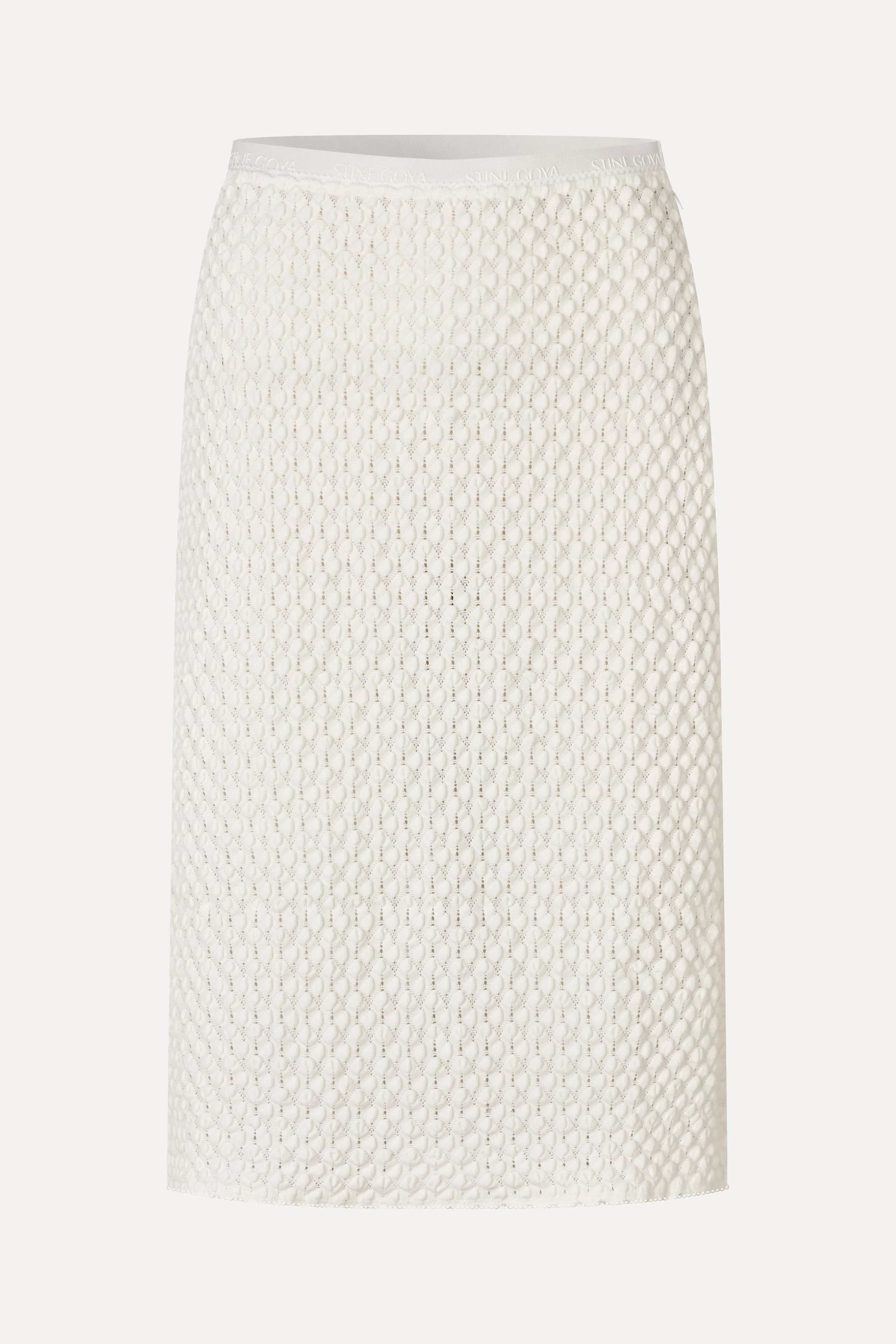 White crochet lace pencil skirt with a delicate, open-knit texture. Designed with an elasticated waistband featuring an embossed STINE GOYA logo and a back slit for ease of movement.