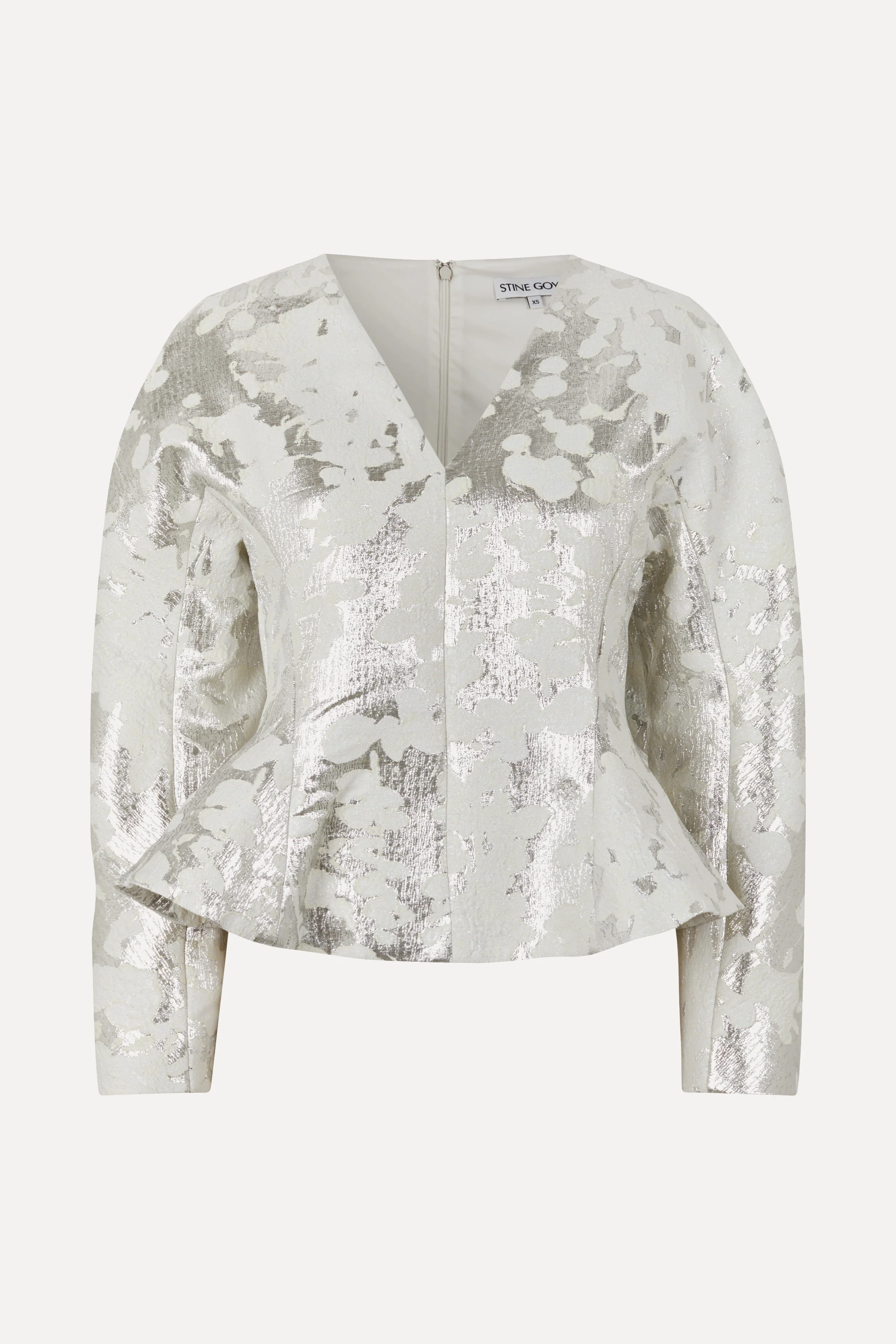 Elegant peplum top in off-white and silver with textured floral metallic jacquard. Designed with long sleeves, a V-neckline, and a hidden back zipper.