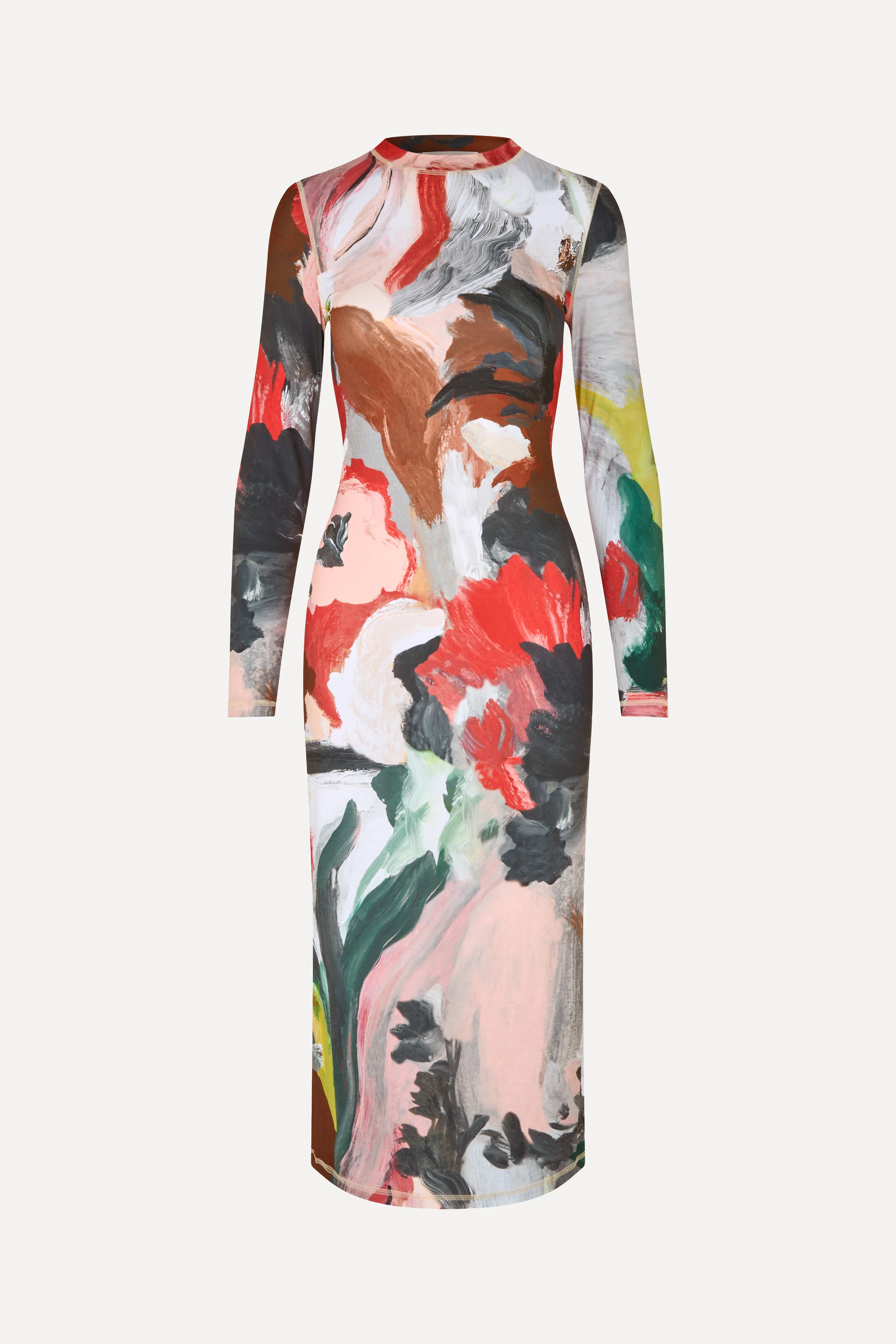 Long-sleeve mid-length dress crafted from a lightweight fabric, featuring an abstract hand-painted stilleben print in rich pink, brown, and cream tones. Designed with a relaxed A-line silhouette for effortless movement, a soft turtleneck, and a hidden zip closure at the back for a seamless look.